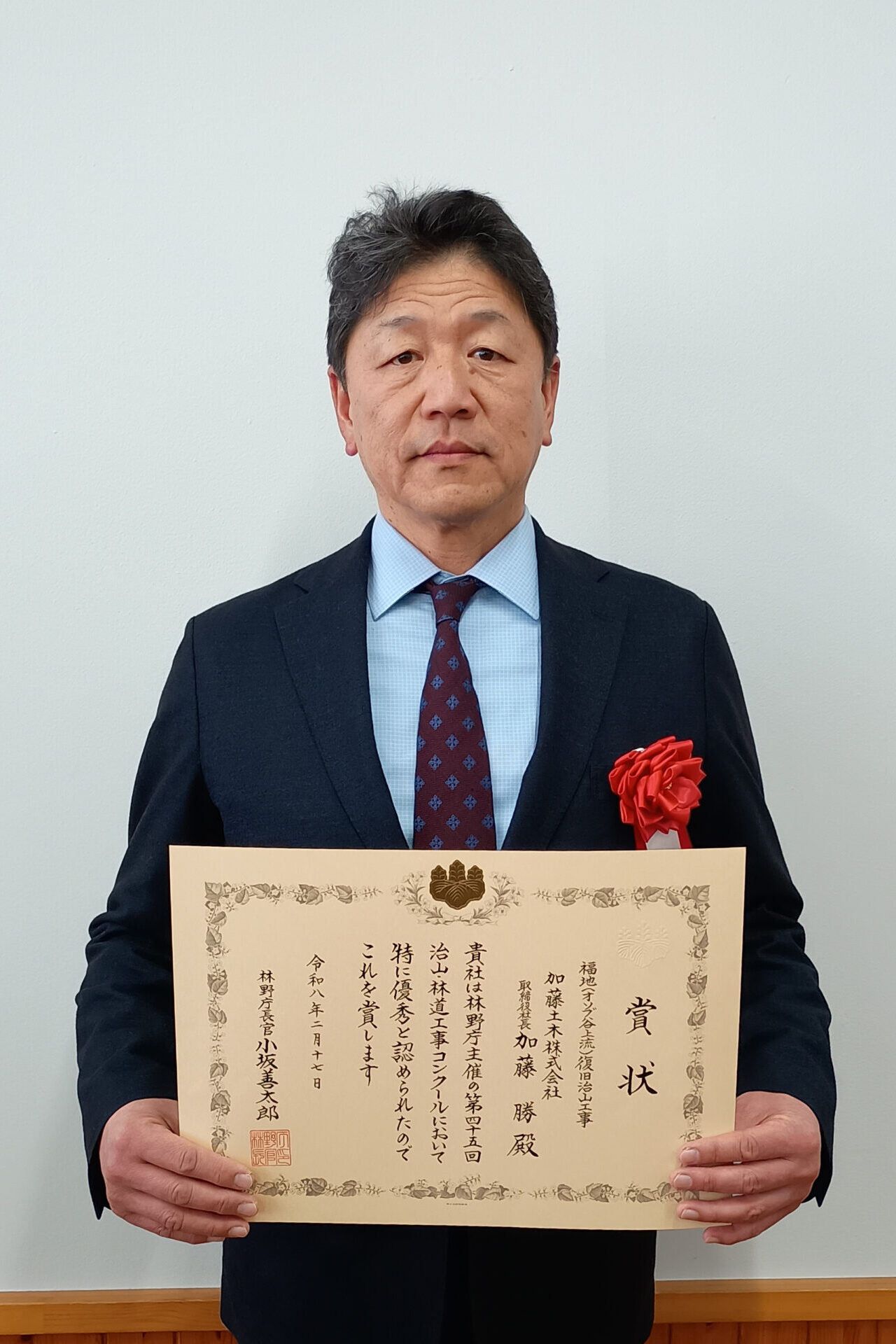 名古屋協会からは治山工事の部で加藤土木株式会社 取締役社長 加藤 勝さん、林道工事の部でナガイ株式会社 代表取締役 村上 勉さんが林野庁長官賞を受賞されました。以下、概要です。