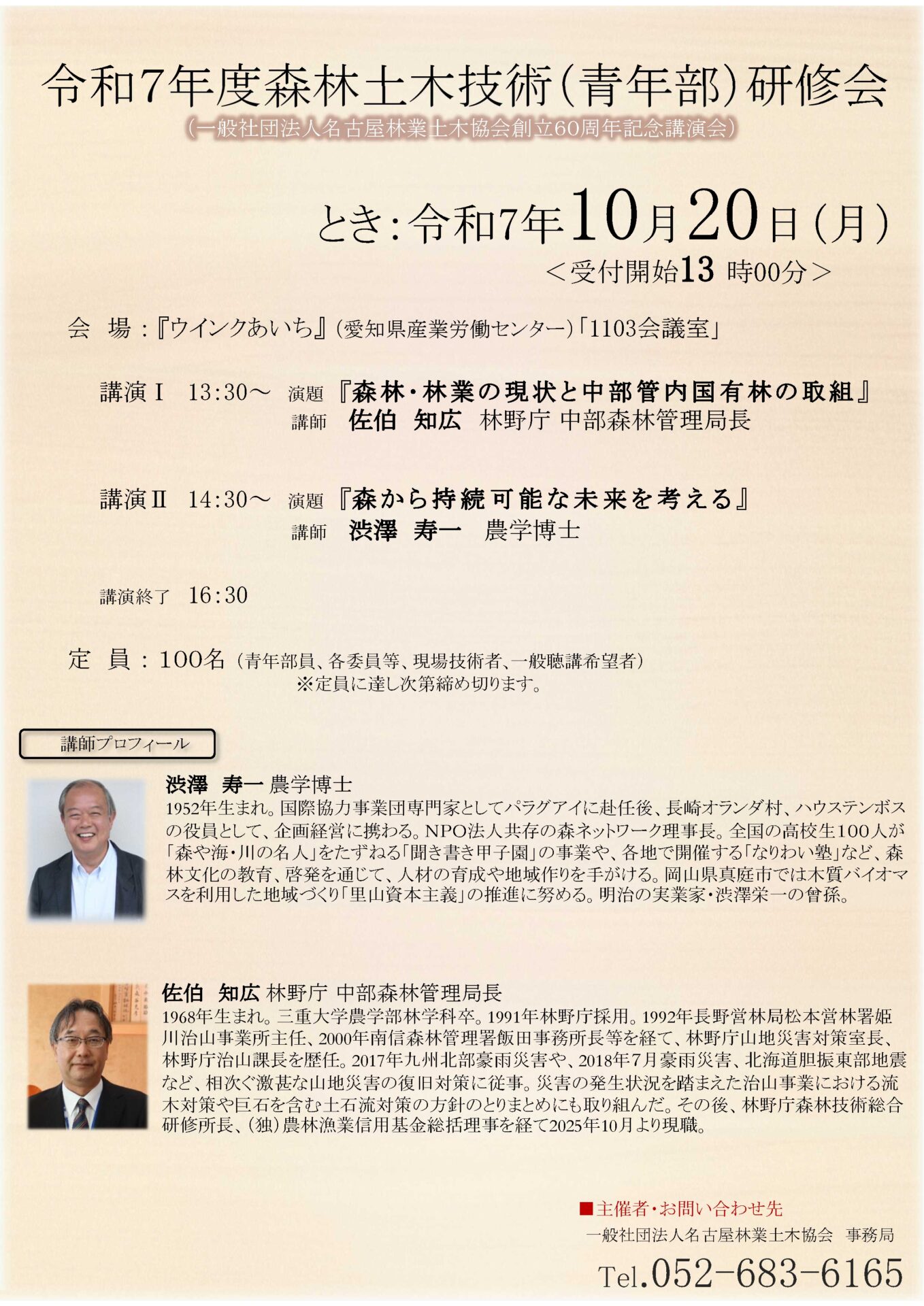 創立60周年記念講演会(JAFEE公開プログラム) 2025年8月22日 最終更新日時 : 2025年10月7日 admin758ringhou 一般社団法人名古屋林業土木協会は、本年10月20日、創立60年を迎えます。これを記念し創立日の10月20日、記念講演会を開催します。聴講を希望される方は下記事務局へ問い合わせください。 令和7年度JAFEE主催森林分野CPD認定公開プログラム企画書ダウンロード