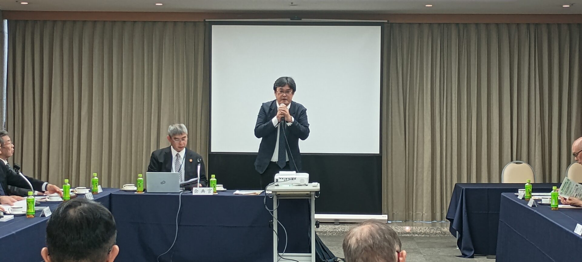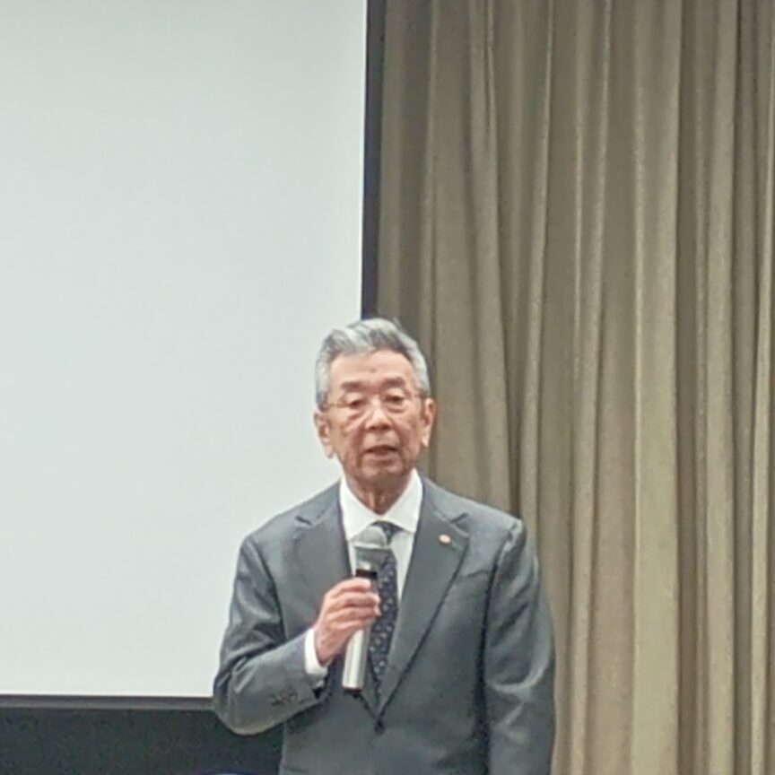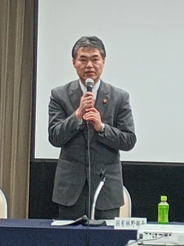 1点目、まず、新年度予算の概算決定でございます。既にご案内の通りと思いますけれども、林野庁全体でですね、総額3112億ということで、一般公共につきましては1899億円ということで、対前年101%になったわけでございまして、まあ、伸びからするとですね、近年の水準を上回る伸びが確保できました。これも皆様方の本当に現場からの声をですね、上げていただいたおかげだと思っております。本当に感謝を申し上げます。ありがとうございました。 また、あの、新谷会長からお話がありましたようけれども、林道につきまして言及がございました。その通りでございますけれども、あまり林道というとですね、他のところからまた怒られますので、特に言いませんけれども。ここ数年ですね、やはり、施業に必要な道の整備というのが遅れている。予算が十分に無いというのは、その通りでございましたので、そういったことも踏まえた予算案にさせていただいております。各局にはですね、これを有効に、本当に地域の力になるような路線選定と工事に努めてほしいというお願いをしております。どうか、せっかくの予算ですから、大事に使って、未来の森林のために良かったというふうにしていきたいと思いますので、ご協力を何とぞよろしくお願いいたします。予算については金額をいろいろ言っておりますけども、それ以上の人件費、資材高騰が現実にあるわけでございますので、やはり事業量をですね、落とさずにどうやっていけるのかということを考えながら、予算編成もですね、ただ金額だけ対前年何%と言ってるだけじゃしょうがないと思っております。その辺は実は政治家の先生ともそういう話をしておりまして、事業量をどう確保するかということを今後ですね、強く考えていきたいと思いますので、ご協力をお願いしたいと思います。