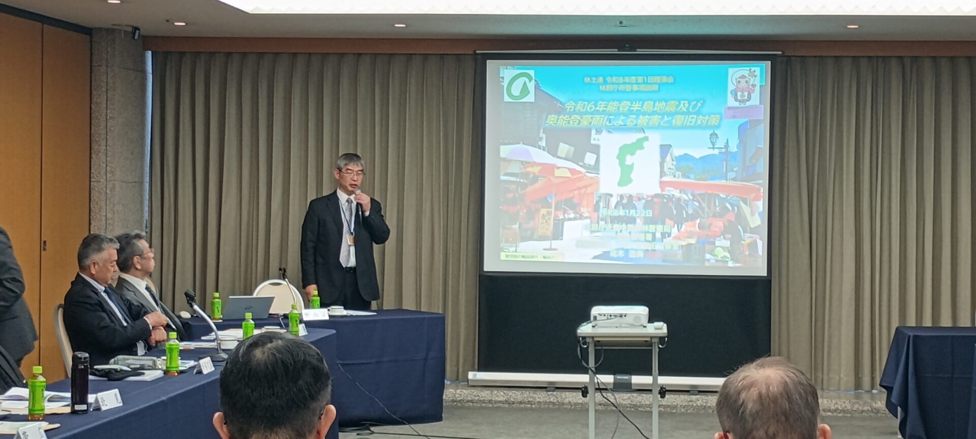 理事会開始前に、林野庁から、長崎屋圭太国有林野部長、藤原司業務課企画官が来賓出席され、令和8年度予算案や最近の情勢、ESDの取り組みなど説明がされました。また、理事会終了後には、尾木浩典 近畿中国森林管理局石川森林管理署 奥能登地区山地災害復旧対策室長から「能登半島地震及び奥能登豪雨による被害と復旧対策」について講演をいただきました。