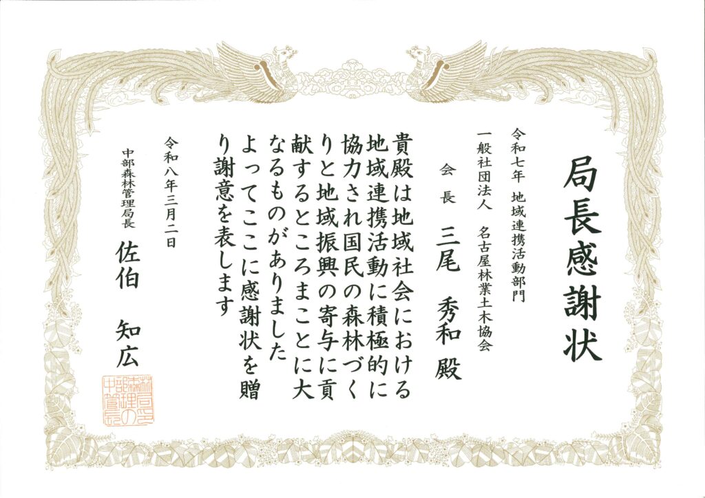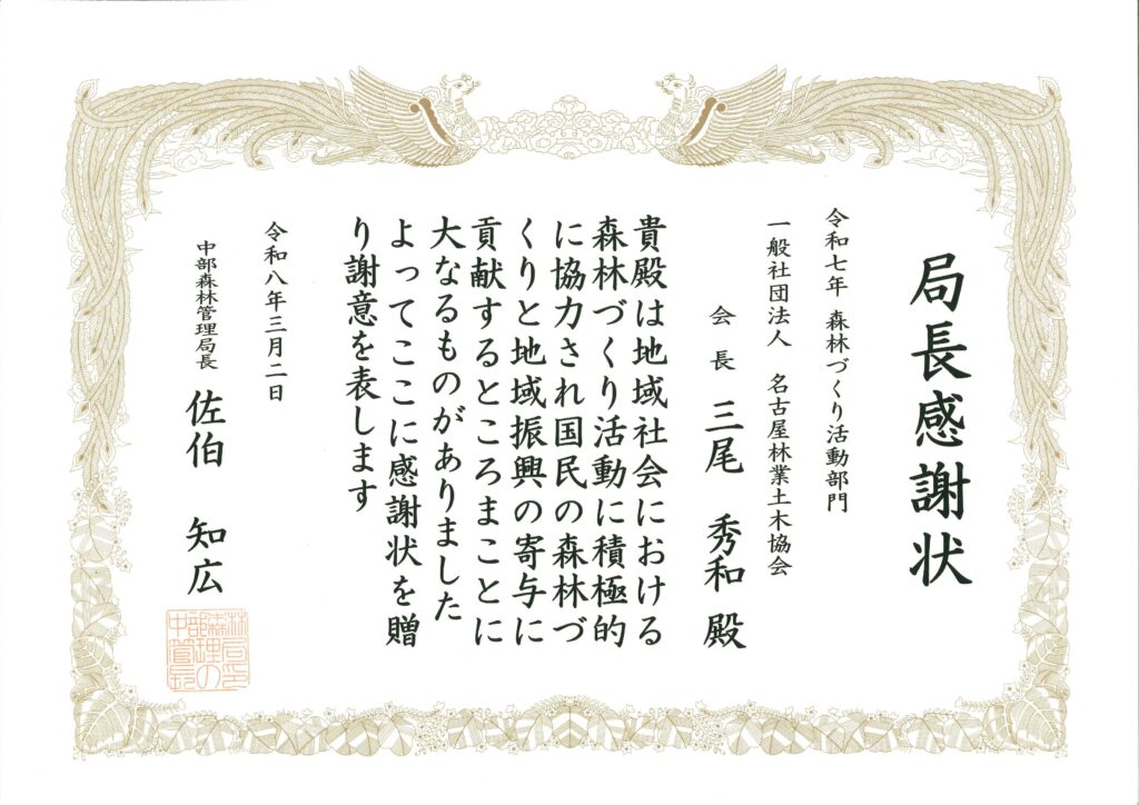 中部森林管理局管内では、災害時における防災ボランティア活動、国土緑化推進等を通じた森林づくり活動並びに地域の奉仕活動等における地域連携・社会貢献活動等に進んで携わる企業、団体に対し「社会貢献感謝状贈呈基準」に基づき、局長感謝状を贈呈されており、令和7年度の名古屋林業土木協会として取り組んだ活動について、令和8年3月2日付けで局長感謝状の贈呈を受けました。