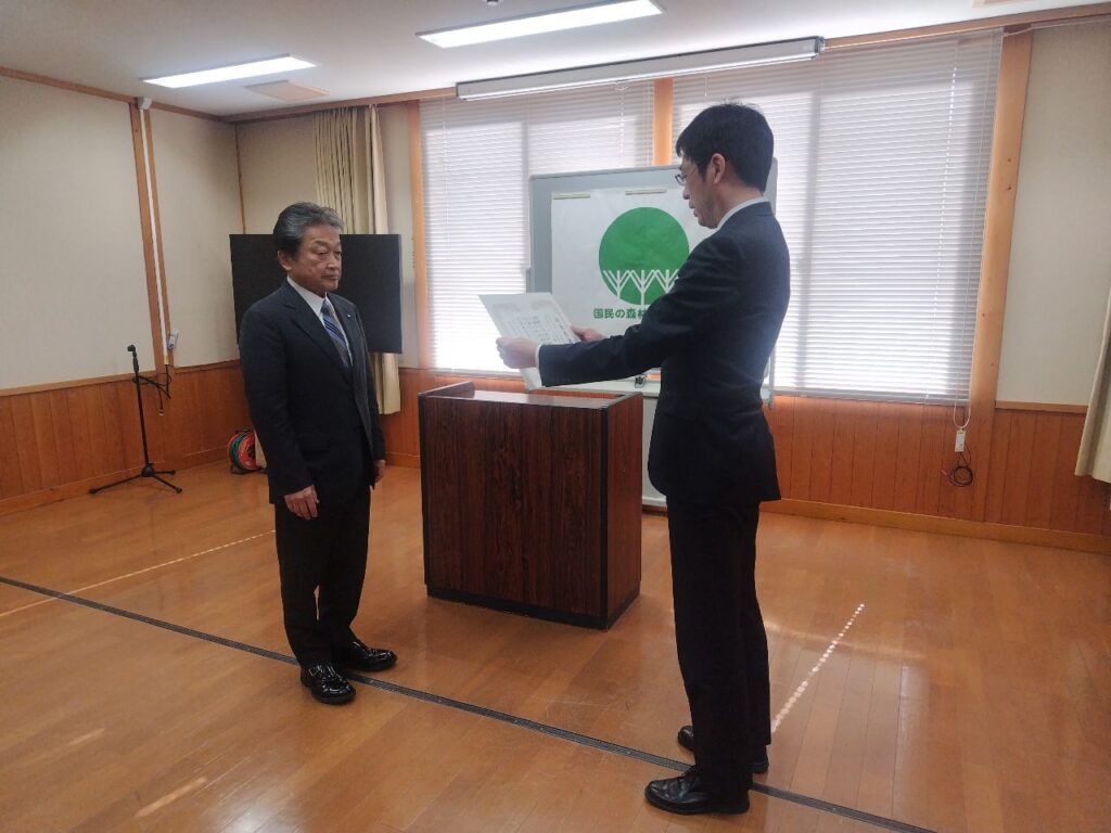 贈呈式は、3月17日(火)、東濃森林管理署会議室において見市 貴司 東濃森林管理署長より感謝状の伝達贈呈式が催され、三尾秀和会長が贈呈を受けました。